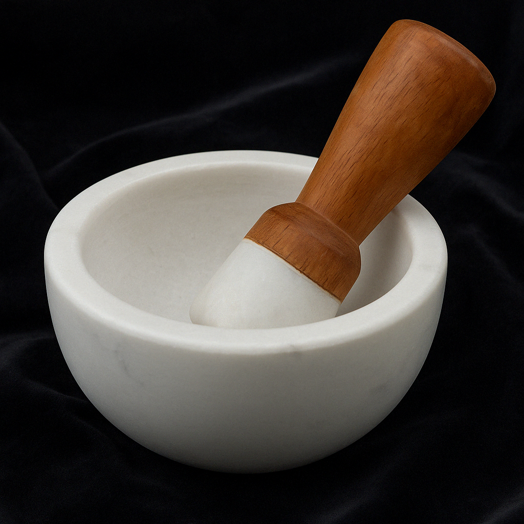 Mortar carved from pure white marble. A sacred tool for rituals, ancestral kitchen work, and everyday alchemy.