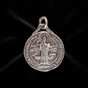 Protective Saint Benedict medal in aged silver, a sacred symbol against evil and negative energies.