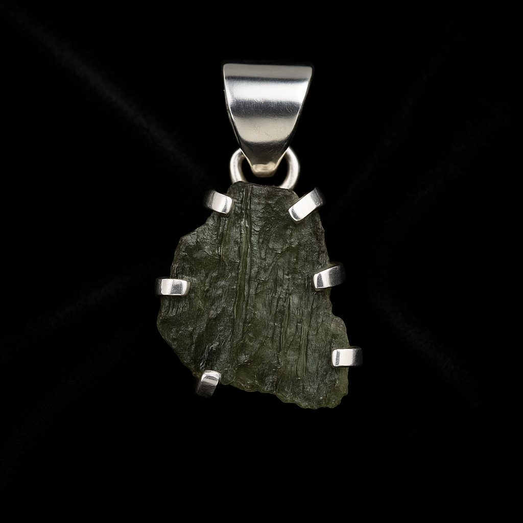 Mysterious and powerful, this raw moldavite is set in sterling silver, radiating cosmic energy and transformation.