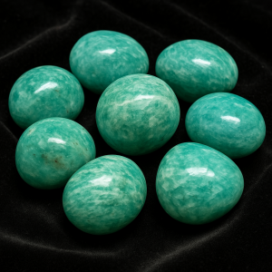 Tumbled Amazonite stones from Mozambique with vibrant green tones and a polished finish. A harmonizing stone ideal for calming the soul and balancing emotions.