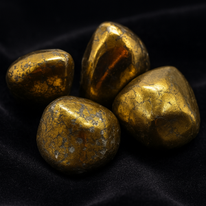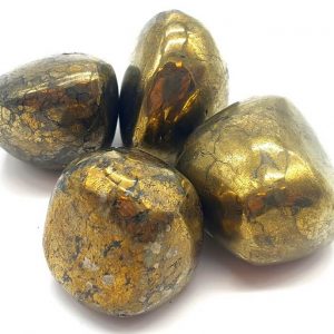 Natural chalcopyrite tumbled stones from Brazil. Golden-shining stone ideal for activating vital energy, attracting abundance, and unblocking chakras.