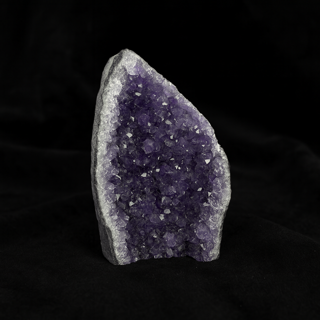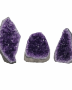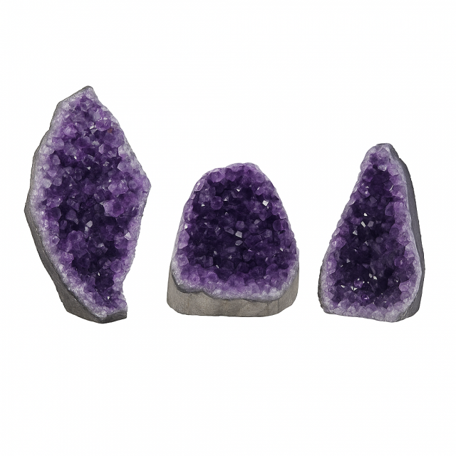 Cut-base amethyst clusters are natural crystal formations that have been carefully prepared to stand upright. These pieces, sourced from Brazil, are known for their deep violet hues and the mesmerizing depth of their crystal points, resembling miniature temples of light.