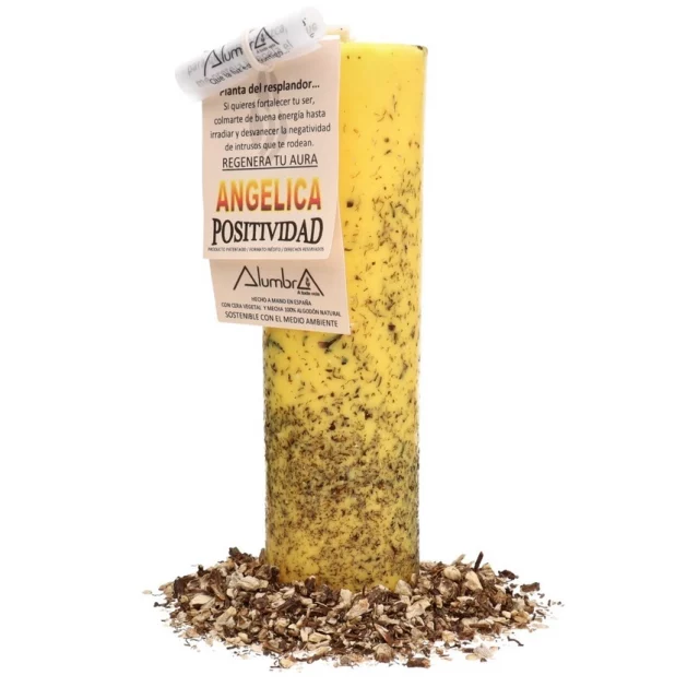 Handcrafted candle with natural angelica root, perfect to purify spaces, attract good energy and uplift your spiritual vibration.