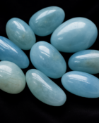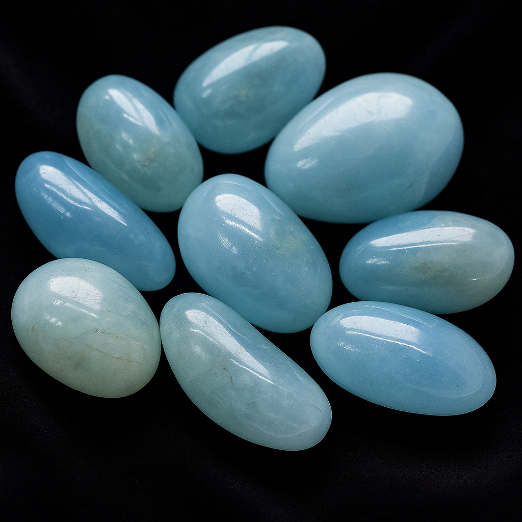 These soft and beautiful aquamarine tumbled stones come from Madagascar, featuring a light crystalline blue and gentle translucent sheen. Hand-polished, they evoke the calm of deep waters and the whisper of the sea on your skin.