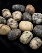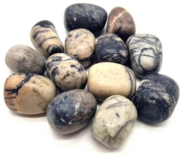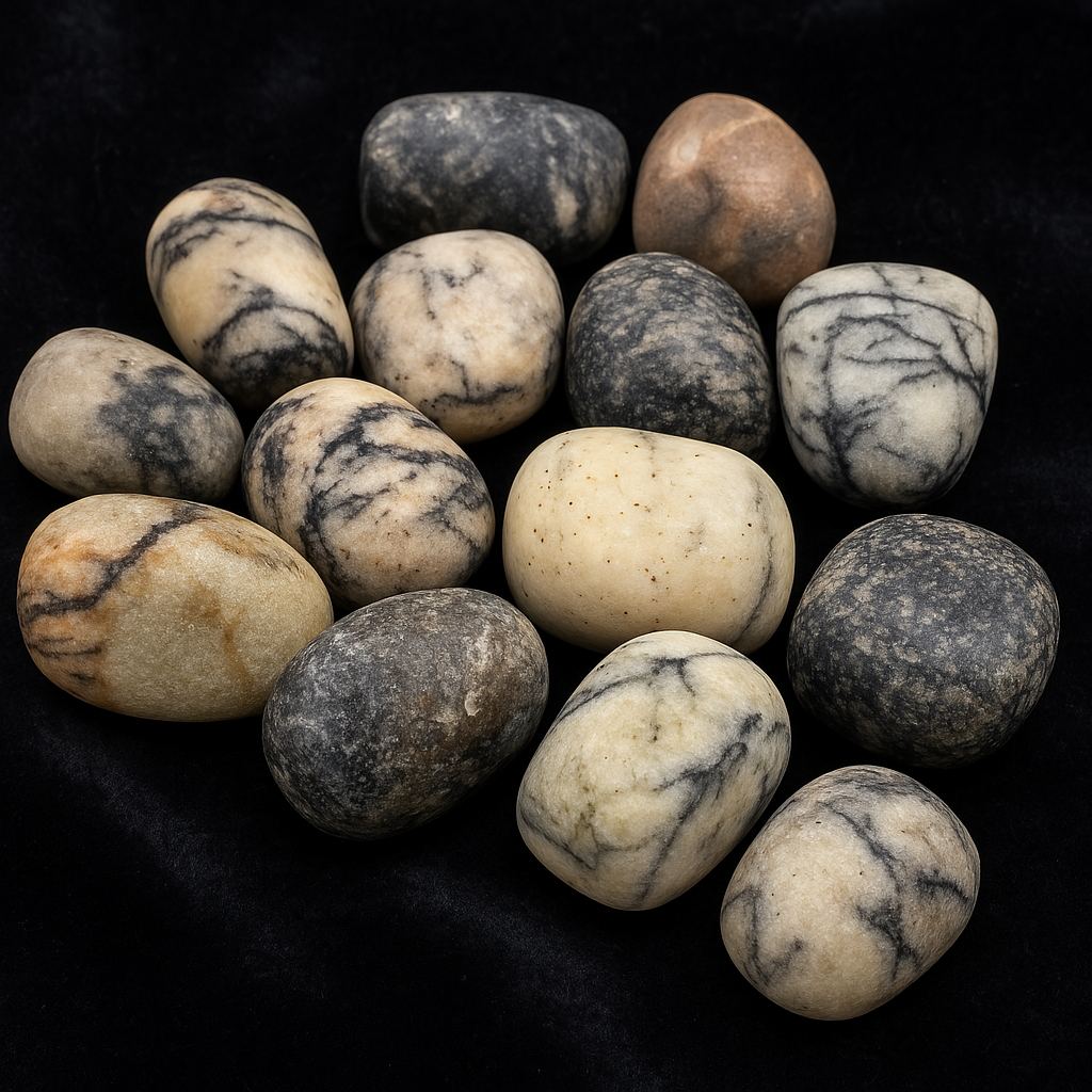 These black agate tumbled stones come from the United States and have been polished to reveal their unique aesthetic: dark veins entwined with cream, grey, and earthy tones, reflecting the harmony between shadow and light.