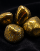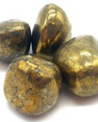 Natural chalcopyrite tumbled stones from Brazil. Golden-shining stone ideal for activating vital energy, attracting abundance, and unblocking chakras.