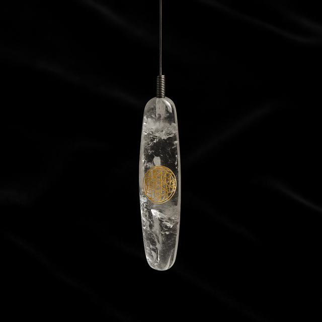 Crystal quartz biotensor with a golden Flower of Life symbol, crafted to enhance energy and support dowsing work.