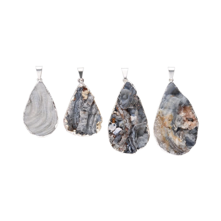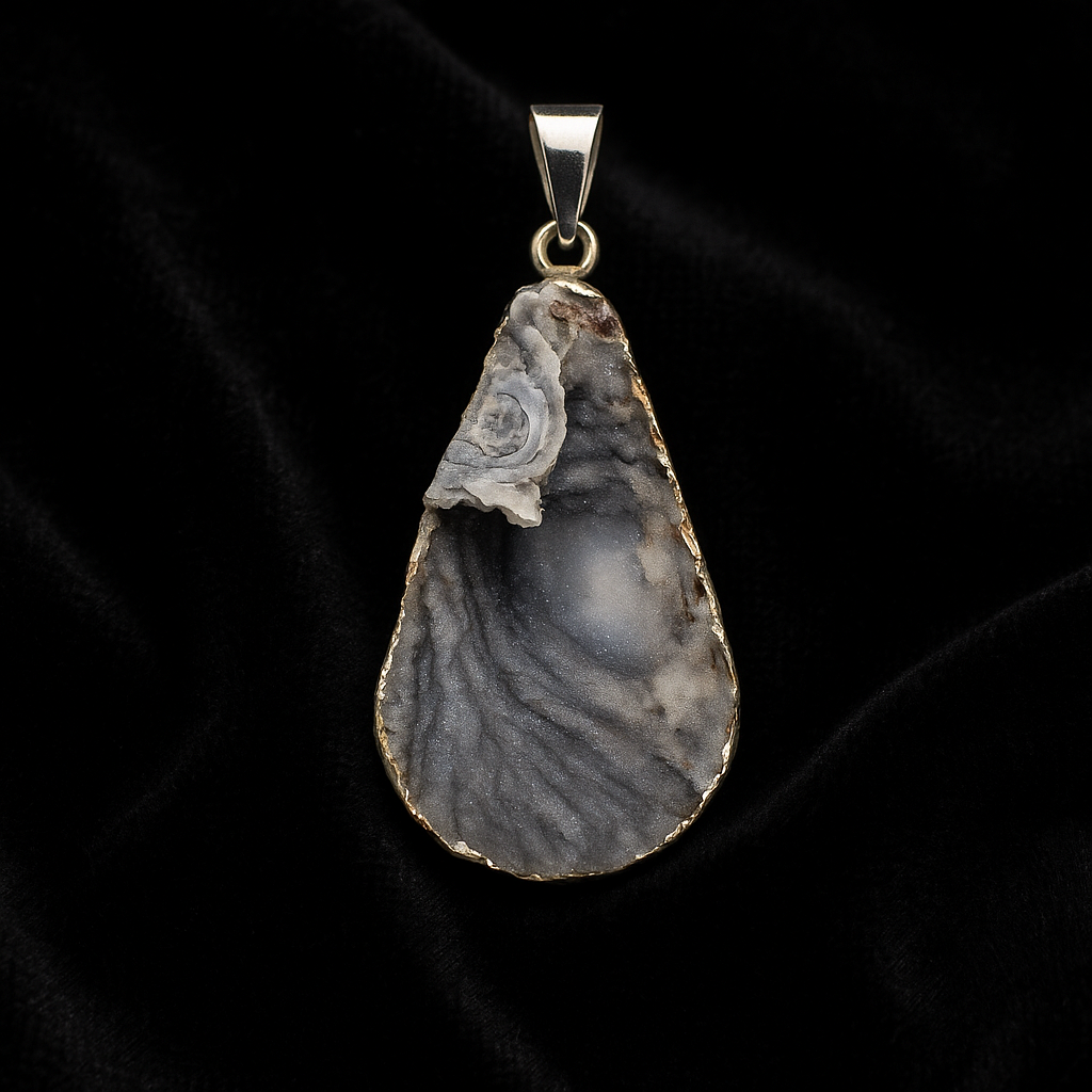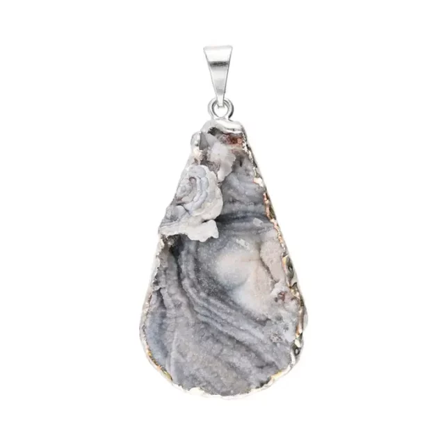 This crystallized chalcedony pendant is a one-of-a-kind piece, raw-cut and retaining its natural texture, making it a truly authentic and powerful jewel. With pearl-gray hues and mineral nuances, chalcedony is known for promoting inner peace, enhancing communication, and softening intense emotions.