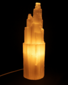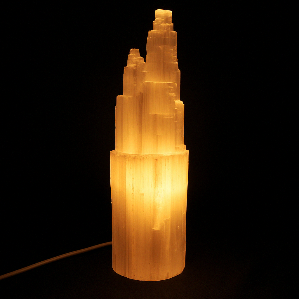This stunning selenite lamp, sourced from the mystical lands of Morocco, is carved into a tower to symbolize the rise of spiritual energy. Its soft, translucent glow bathes any space in a calming, protective light that promotes peace, clarity, and energetic balance.