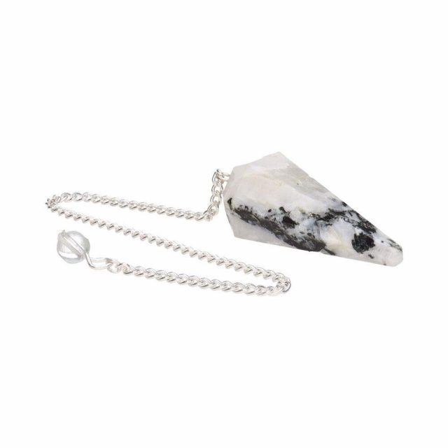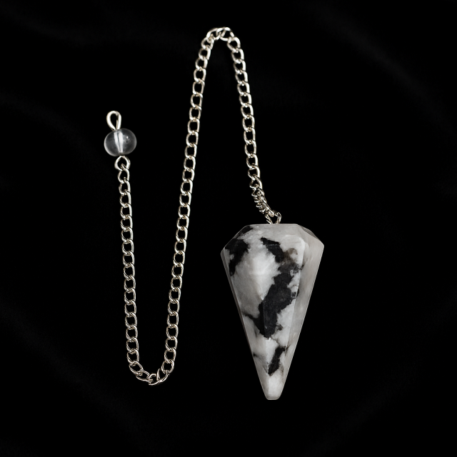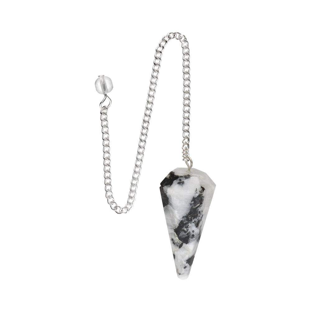This faceted Moonstone pendulum merges pearly tones with a mystical aura, ideal for intuition and spiritual connection.