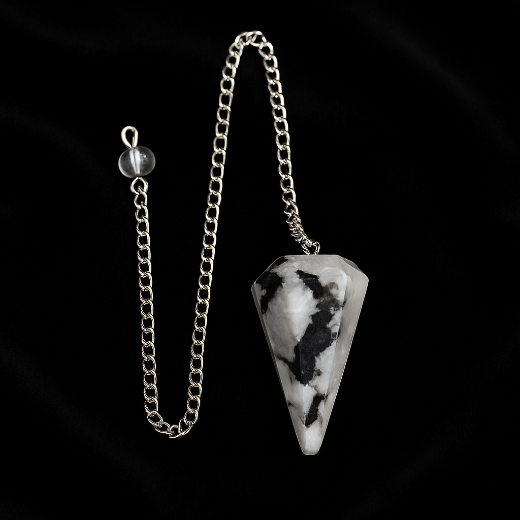 The Faceted Moonstone Pendulum is a subtle yet powerful tool that channels emotional and mystical energies. Its white surface laced with dark veins evokes the moon’s dance with shadows, inviting introspection, emotional balance, and spiritual openness. Perfect for sacred feminine work, moon meditations, and decision-making during uncertain times, this pendulum accompanies sensitive souls on their inner journeys. Since ancient times, Moonstone has been revered as a symbol of protection, revealing dreams, and psychic sensitivity.