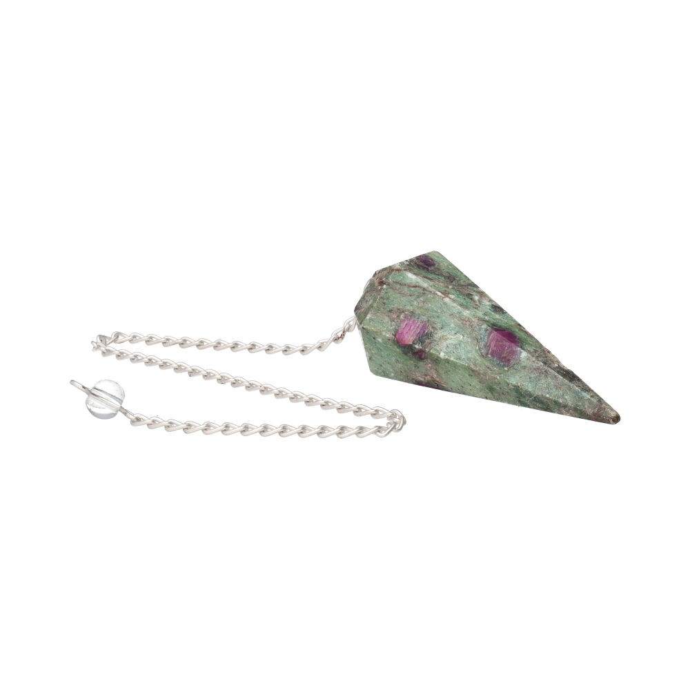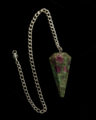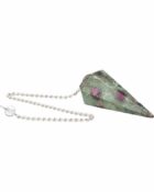The Ruby in Zoisite pendulum is an energetic gem that blends the fiery vitality of ruby with the calming energy of zoisite. This rare combination harmonizes the heart chakra with a vibrant yet balanced frequency, ideal for those seeking spiritual growth without losing joy. Cut into a faceted cone shape, the pendulum enhances clarity in divination practices, emotional healing, and energy channeling. Its silver-toned chain adds an elegant touch, highlighting the natural beauty of its red and green veins—as if Earth itself had fused fire and forest into one sacred crystal.