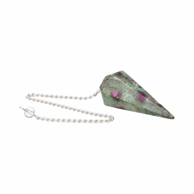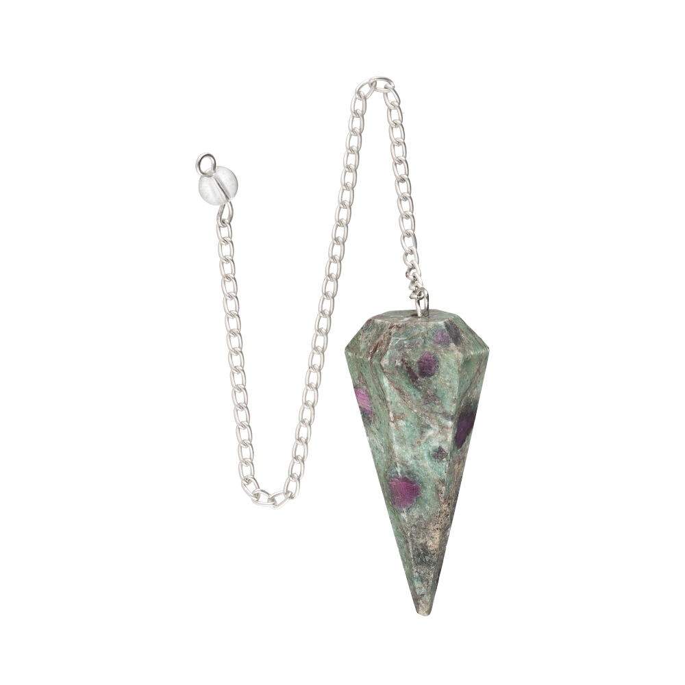 Natural ruby in zoisite pendulum, hand-carved into a faceted cone shape, ideal for dowsing, channeling and spiritual heart connection.