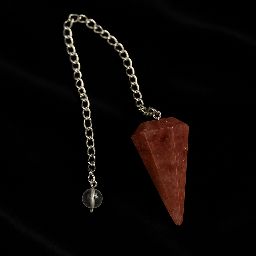 This pendulum is carved from natural strawberry quartz, a crystal imbued with loving, gentle, and protective vibrations. With its rich pink hue, it resonates deeply with the heart chakra, aiding in emotional healing, self-love cultivation, and the attraction of harmonious relationships.