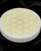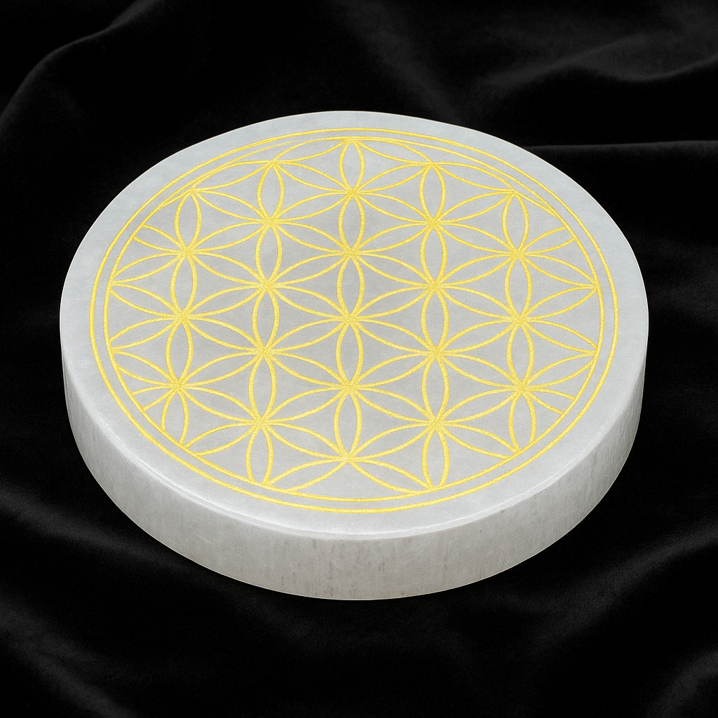 This round white selenite plate with golden engraving is a unique vibrational piece. Handcrafted in Morocco, it features the sacred geometry of the Flower of Life, an ancient symbol of universal harmony and connection. Its energy cleanses spaces, dispels negative energy, and is perfect for placing your crystals to protect and recharge them. White selenite is known for its high vibration and ability to bring mental clarity, inner peace, and spiritual connection. This plate merges aesthetics, function, and powerful spiritual charge. Available in two versions: White (pure white) and Gold (with golden engraving).