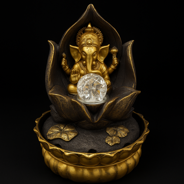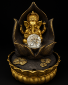 A decorative golden resin fountain featuring Lord Ganesh seated on a lotus, perfect to attract harmony and good fortune at home.