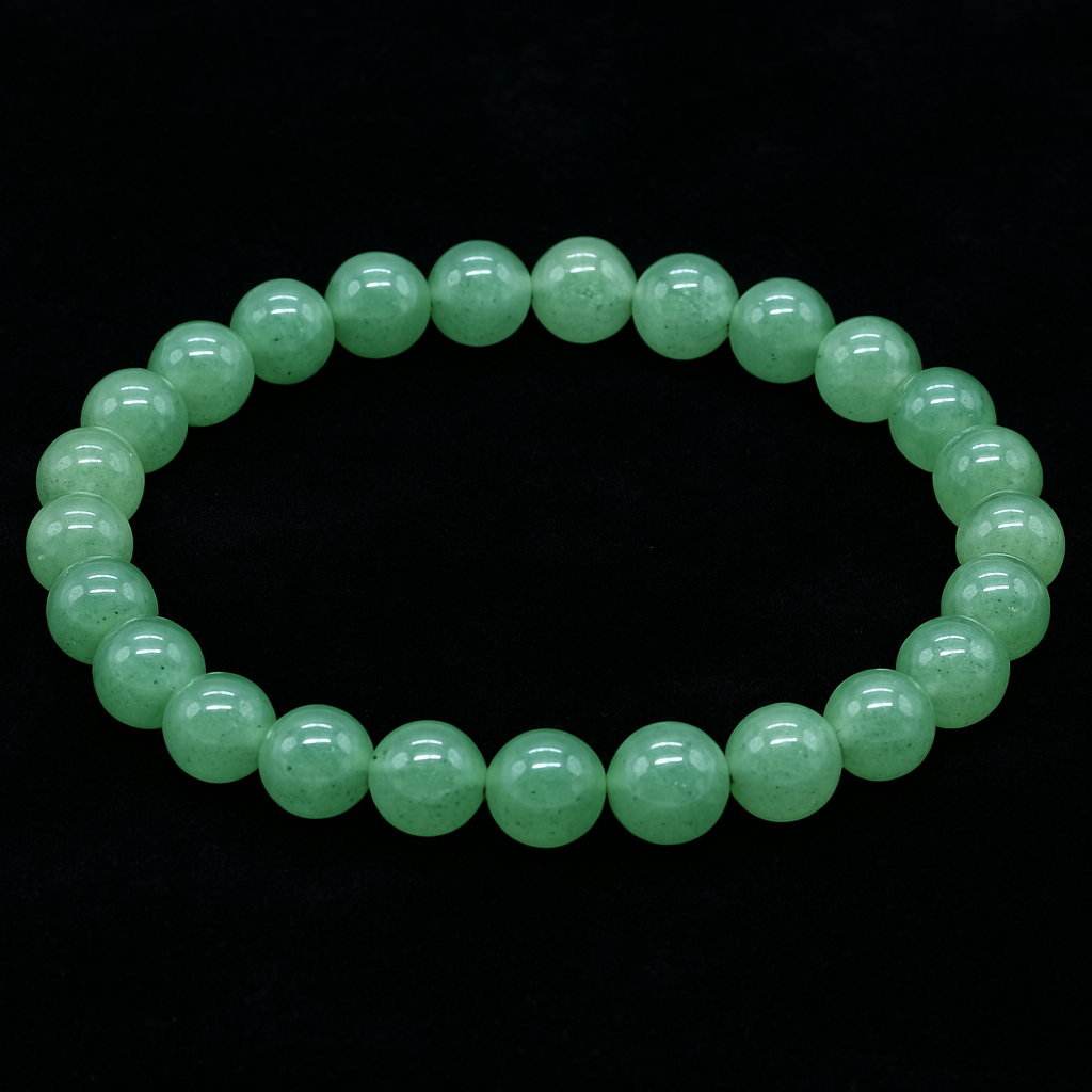 This beautiful bracelet is made of natural green aventurine from India, crafted with polished beads and strung on a strong elastic cord. Its soft, luminous green tone makes it a subtle yet powerful spiritual jewel.