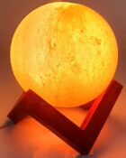 Himalayan salt lamp carved in a spherical shape. Perfect for purifying spaces and providing warm, ambient light.