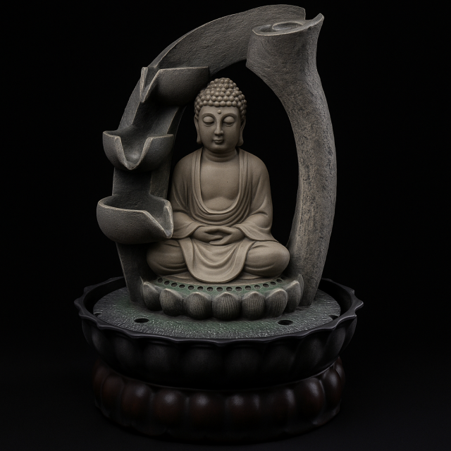 This striking 28 cm fountain blends art, spirituality, and the flow of water into a single piece. Crafted in resin with realistic detail, it features Buddha in deep meditation seated on a lotus, while a gentle three-tiered cascade flows beside him, encased within a textured arch.