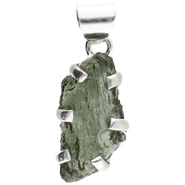 Powerful pendant made with natural moldavite set in 925 sterling silver, featuring an open bezel to enhance its vibrational energy.