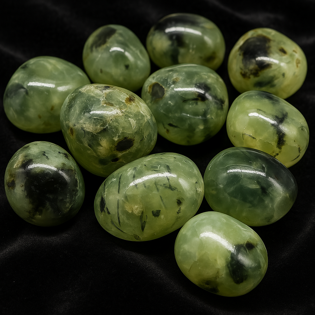 This natural prehnite tumbled stone comes from India and features a beautiful translucent green hue, often with dark inclusions that give it a mystical and enchanting appearance. It is a stone closely linked to inner peace, intuition, and energetic balance.