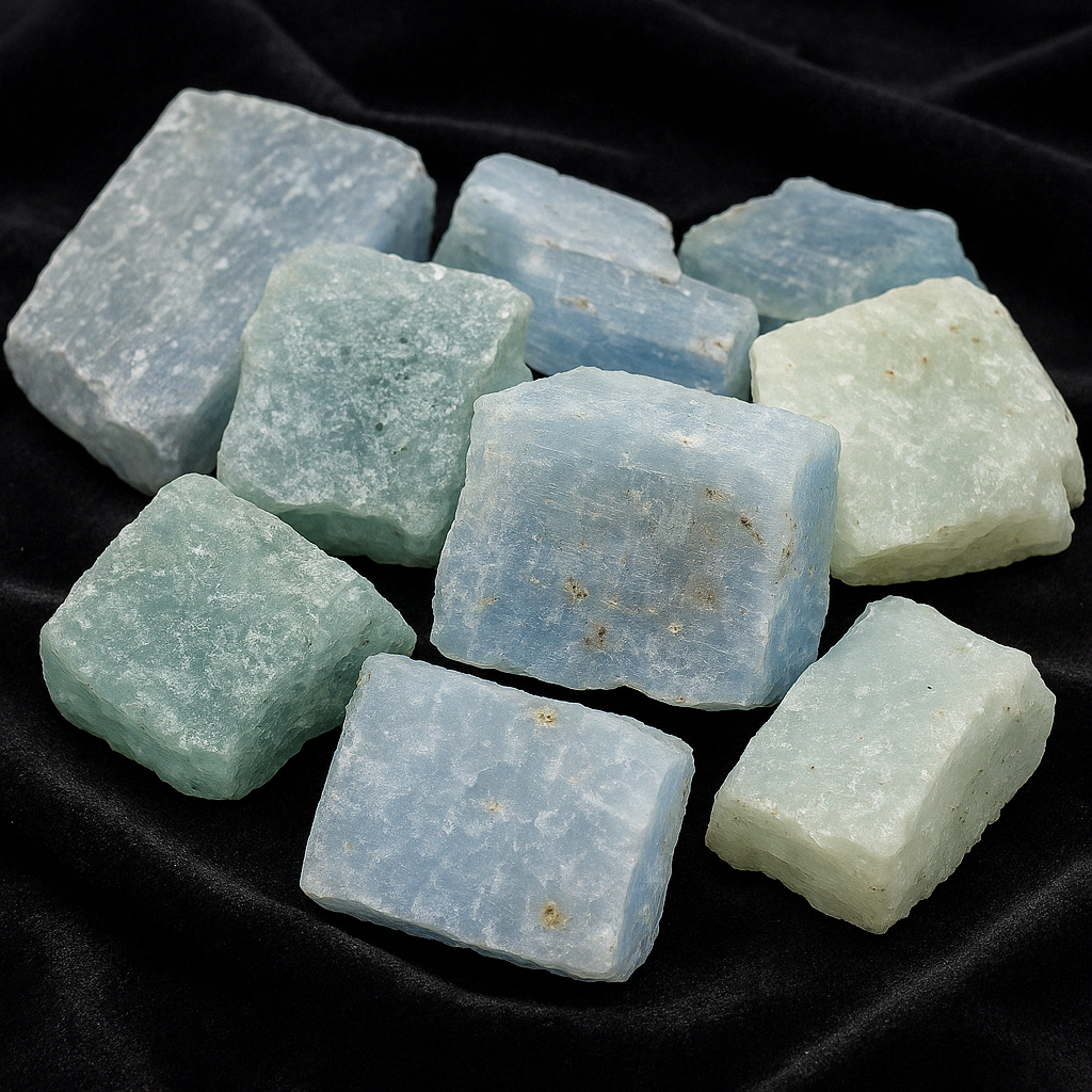 These raw aquamarine pieces, sourced directly from Madagascar, retain their natural mineral texture and display a soft palette of blues, greens, and seafoam tones. Their translucent surfaces and wild formations echo the crystal-clear waves of the ocean.