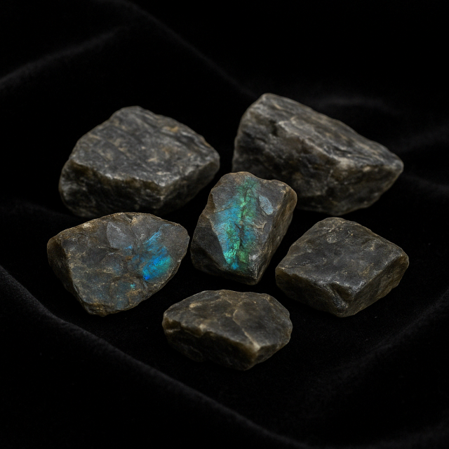 Raw labradorite stones with magical iridescent flashes, perfect for energy protection and spiritual connection.
