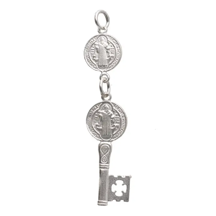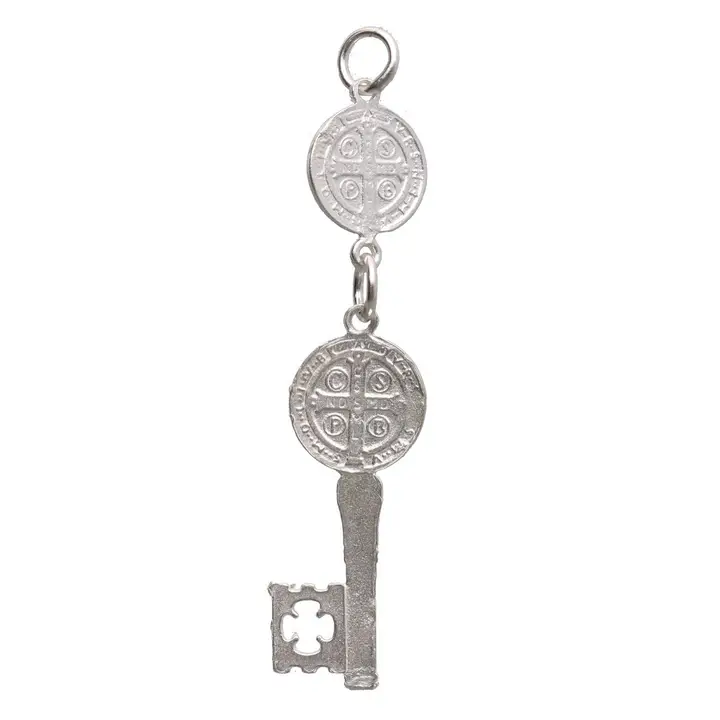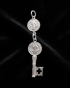 Silver key with the Saint Benedict medal, a symbol of protection and opening of spiritual paths.