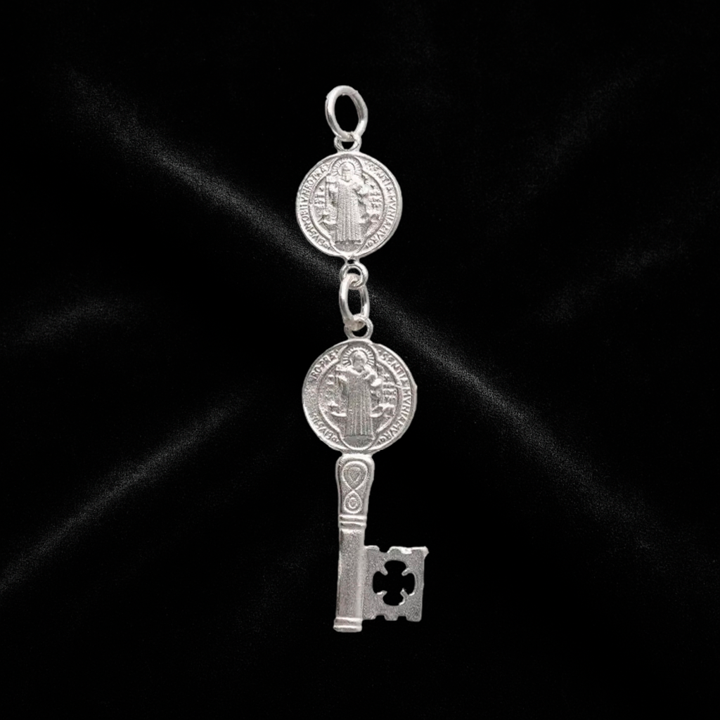The Saint Benedict key is a powerful spiritual symbol that combines the iconic Saint Benedict medal with the shape of a key, representing the opening of paths, the removal of obstacles, and protection against evil. This piece, crafted in silver, is ideal for those seeking a talisman of faith, spiritual strength, and energetic shielding.