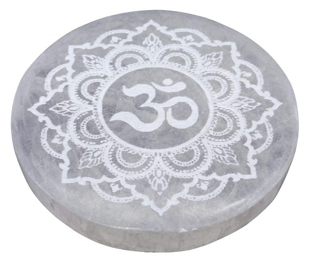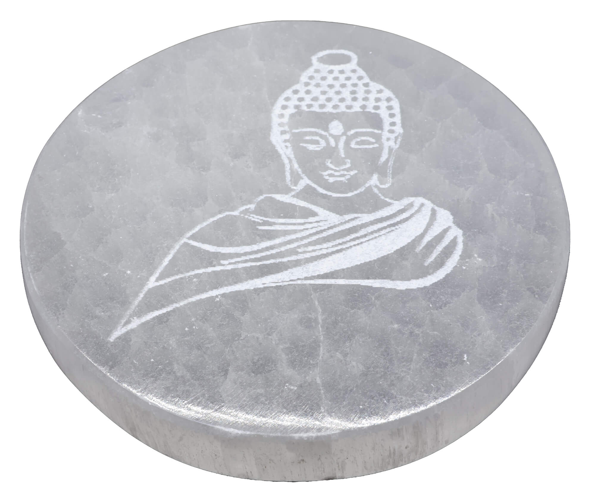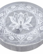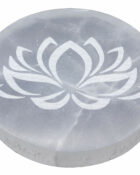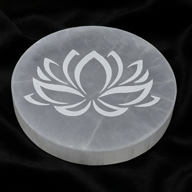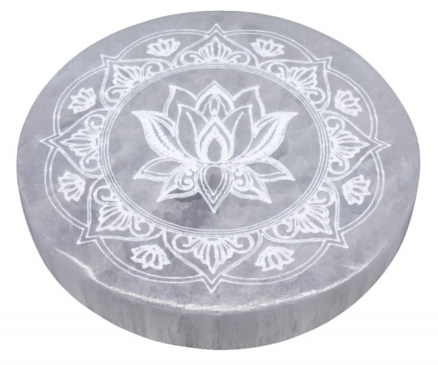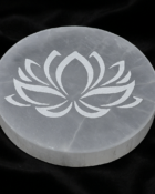 Round natural selenite plate with engraved lotus flower, perfect for charging and cleansing crystals.