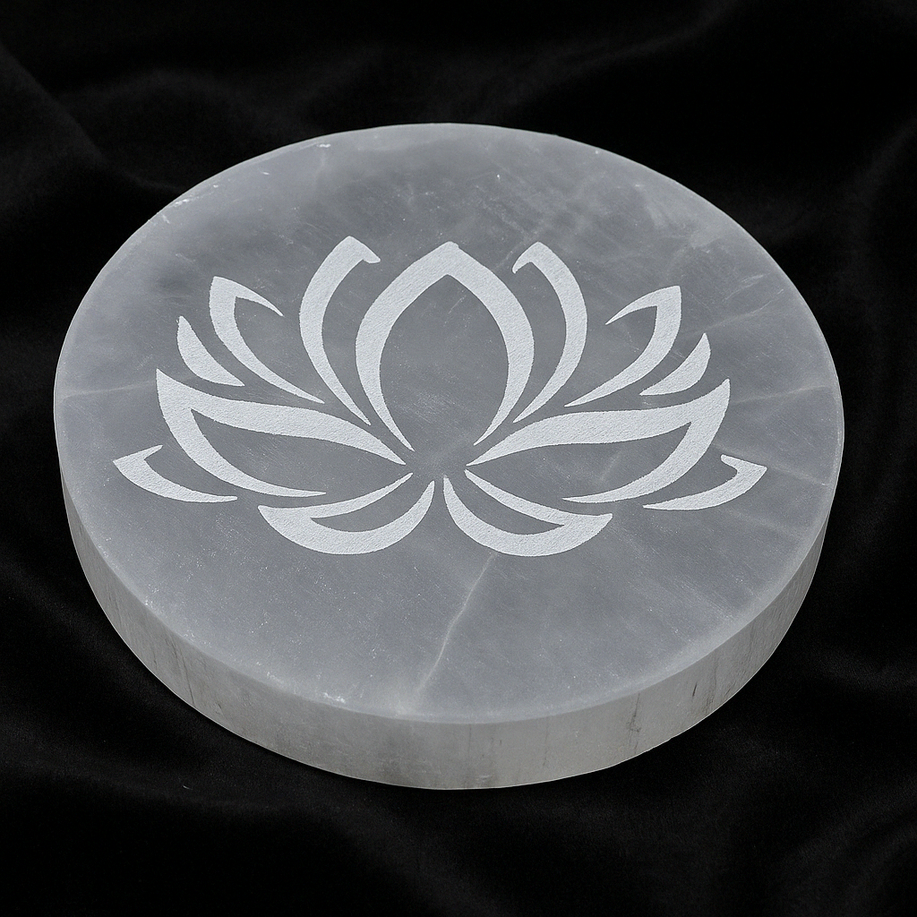 This beautiful white selenite plate, engraved with a delicate lotus flower, is a powerful spiritual and decorative tool. Selenite is known for its ability to clear heavy energies, harmonize spaces, and recharge other minerals. Its flat surface makes it perfect as a charging base for stones and energy jewelry. The lotus flower symbol, associated with purity, enlightenment, and spiritual growth, enhances its healing vibration. Ideal for altars, meditation rituals, or conscious decor.