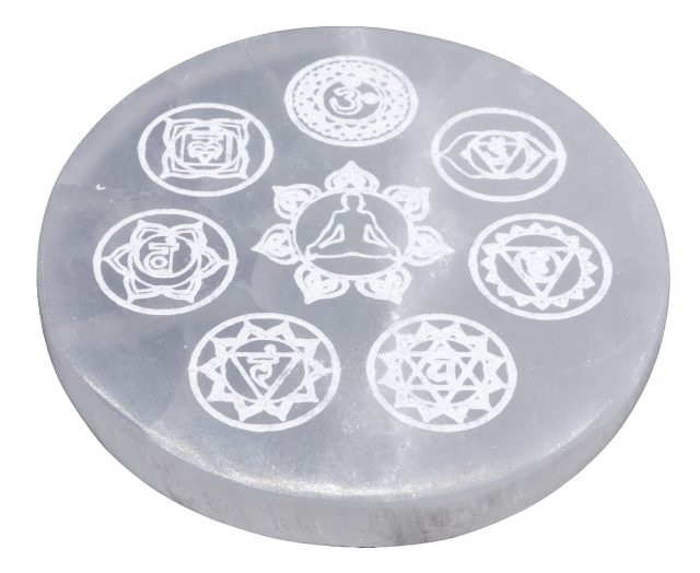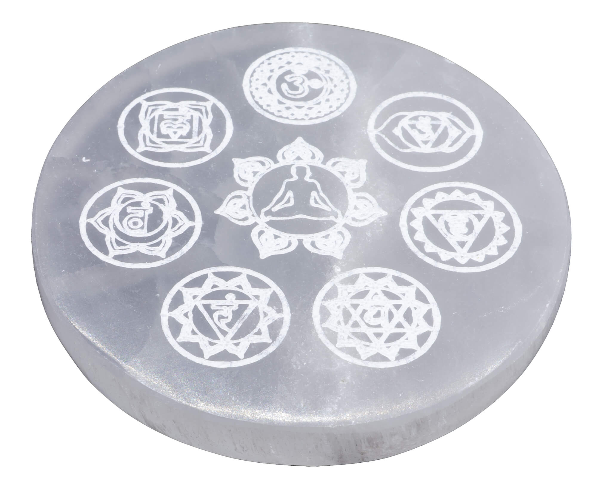 Round selenite plate engraved with Tree of Life, perfect for charging crystals and harmonizing spaces.