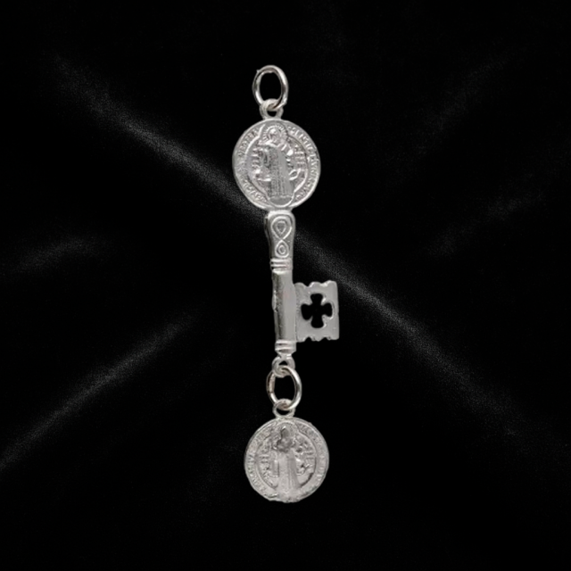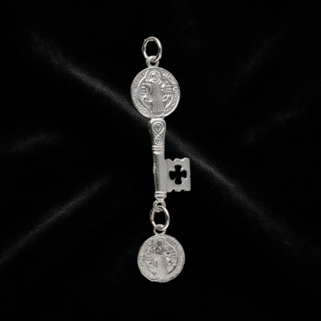 The Saint Benedict key is a powerful spiritual symbol that combines the iconic Saint Benedict medal with the shape of a key, representing the opening of paths, the removal of obstacles, and protection against evil. This piece, crafted in silver, is ideal for those seeking a talisman of faith, spiritual strength, and energetic shielding.