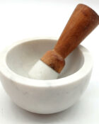 This white marble mortar and pestle, handcrafted in India, radiates purity and tranquility. Measuring 7 x 11 cm, it features a sleek, elegant design with a smooth, solid texture, suitable for both daily use and sacred rituals. White marble has long been revered as a symbol of spiritual cleansing, mental clarity, and divine connection.