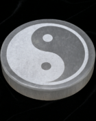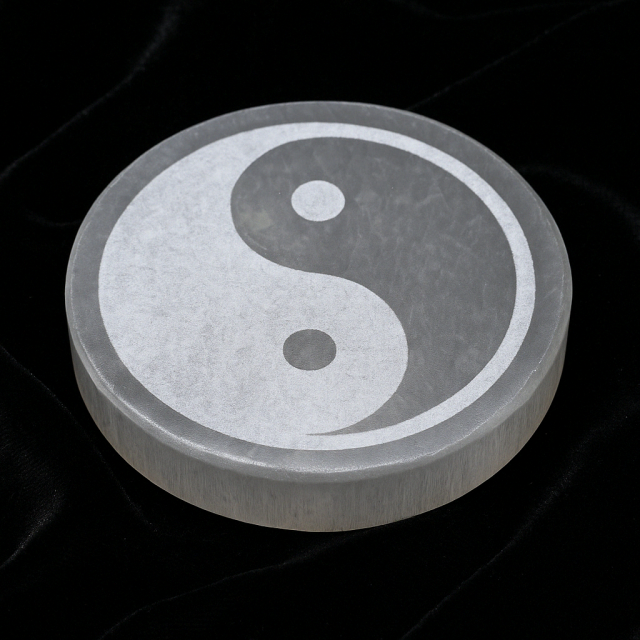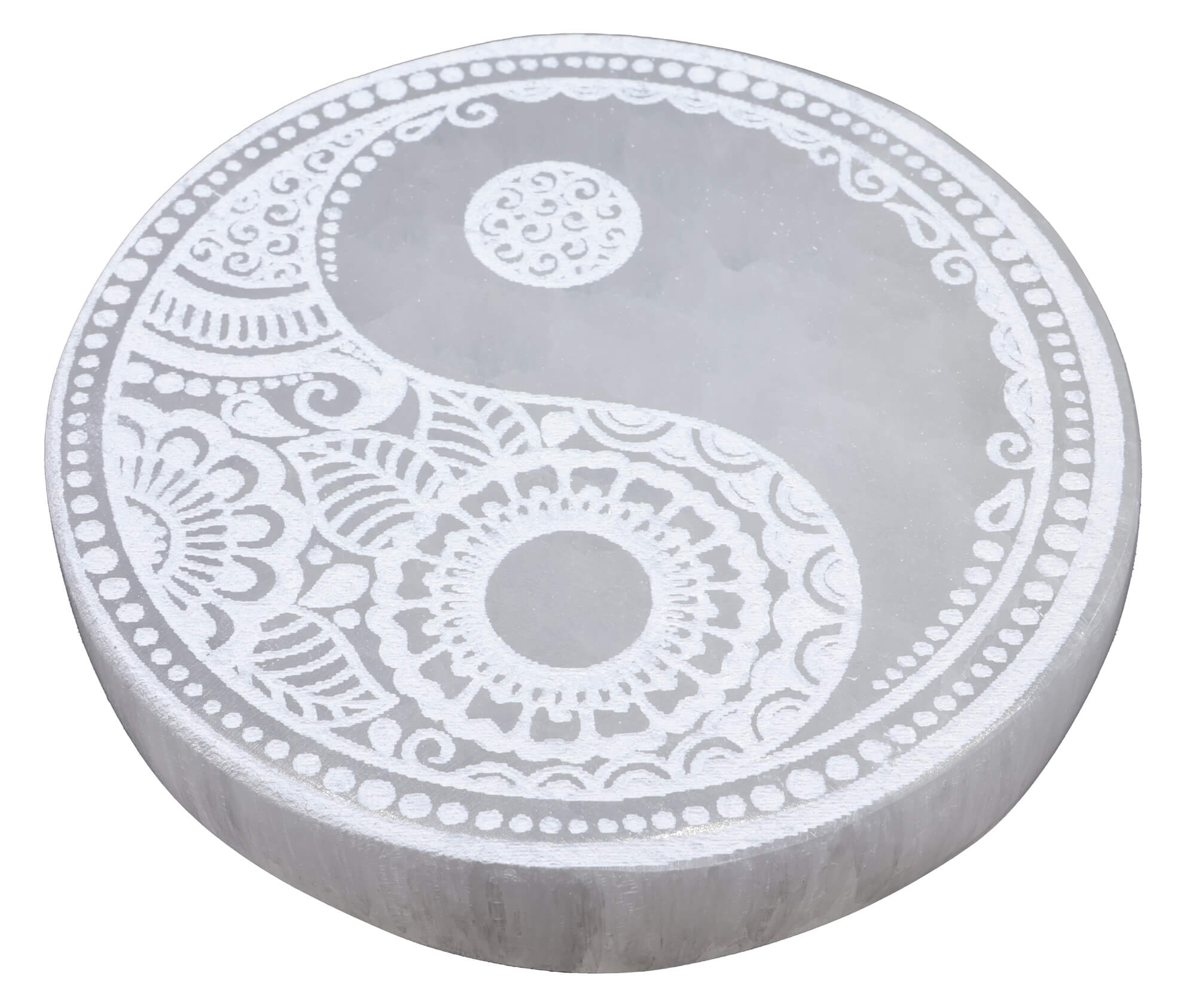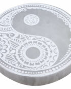 Round selenite plate engraved with a Yin Yang symbol, perfect for recharging crystals and harmonizing spaces.